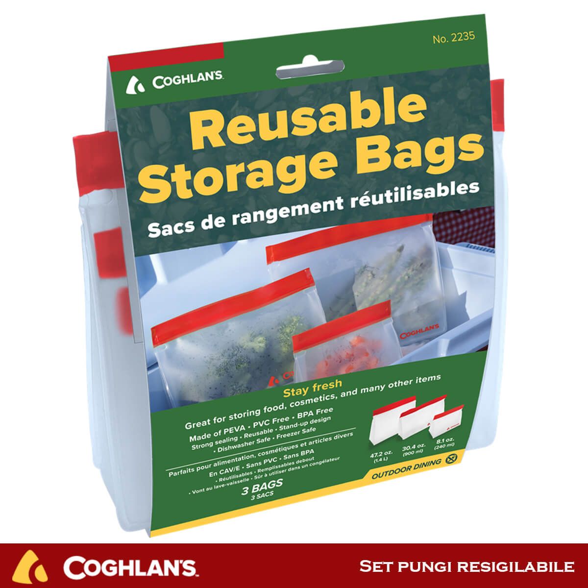 Organizeaza-ti lada frigorifica, trusa de camping sau rucsacul cu pungile de depozitare reutilizabile Coghlans. Usor de curatat si reutilizat, aceste pungi PEVA sunt disponibile in 3 dimensiuni pentru a se potrivi cu o varietate de articole, facand depozitarea alimentelor si a obiectelor personale simpla.